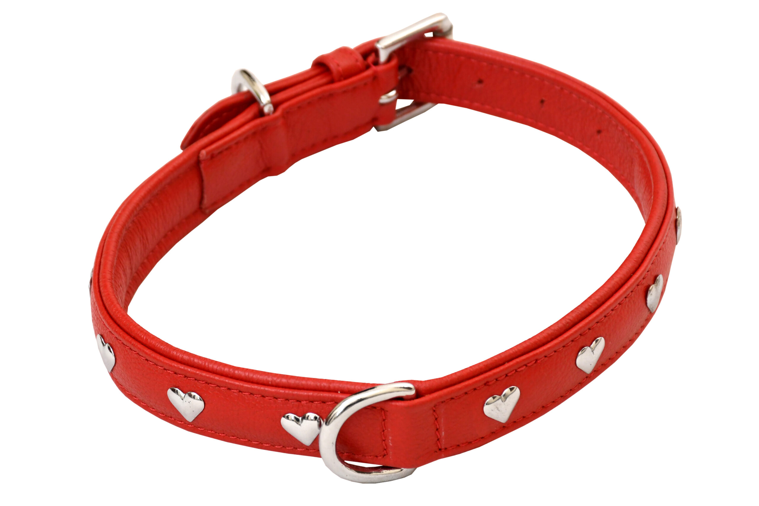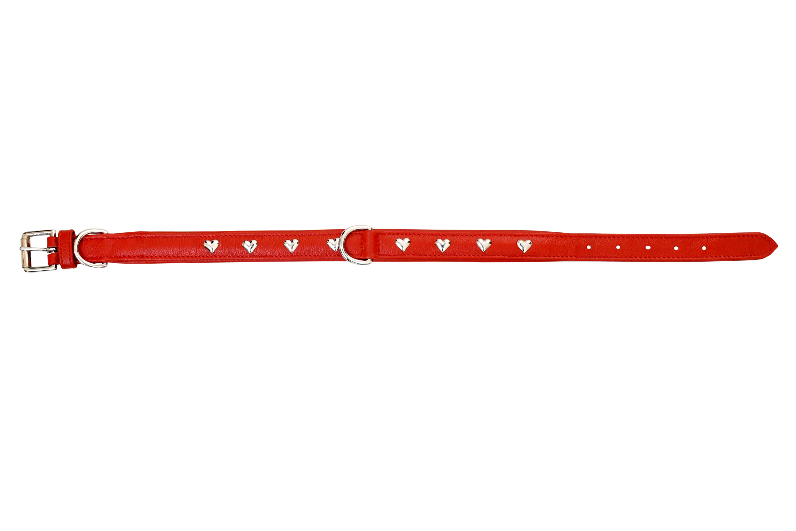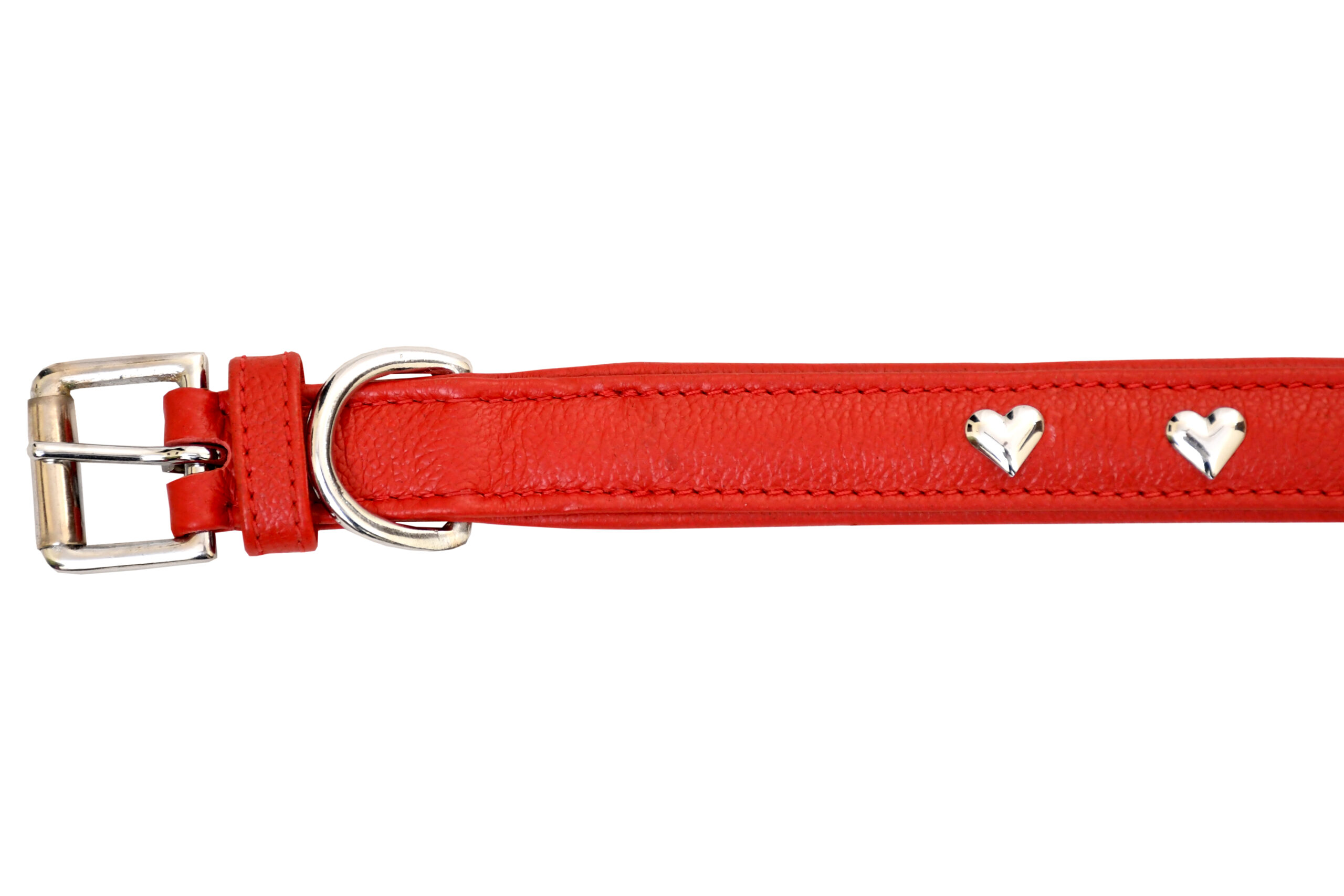 This dog collar is made from soft padded red leather designed to sit gently on the dog’s neck without causing irritation the collar features 8 silver heart-shaped brooches spaced evenly for a clean stylish look the silver buckle allows for easy adjustment and secure fit while the multiple holes offer flexibility for different neck sizes .