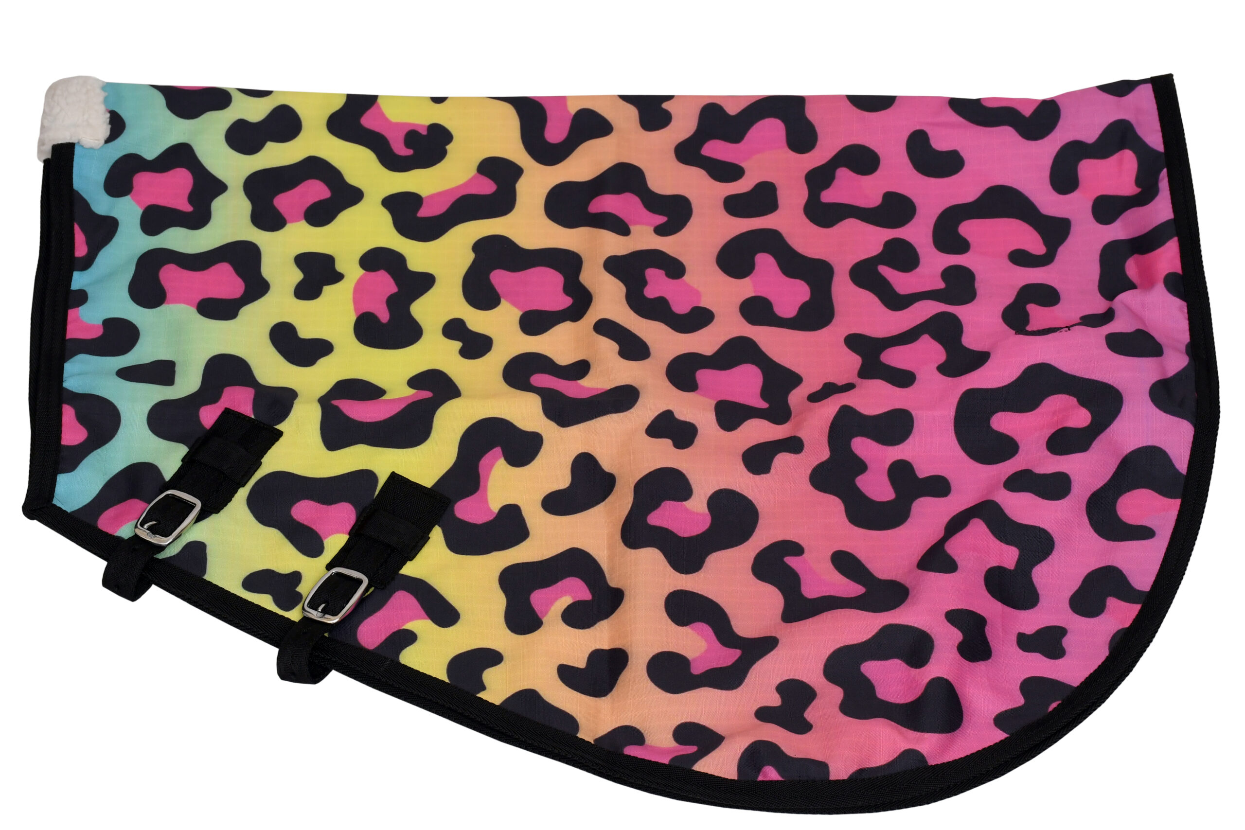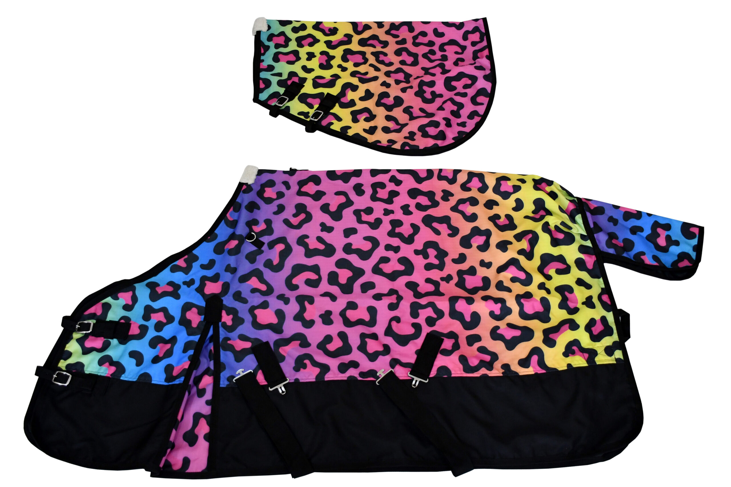 This rug sheet combo features a vibrant leopard print in pink purple blue yellow and green with black trim the set includes a full-body horse rug and a matching saddle pad both made from soft durable material the rug has multiple adjustable straps and buckles to keep it secure during movement while the saddle pad adds cushioning and protects the horse’s back under the saddle .