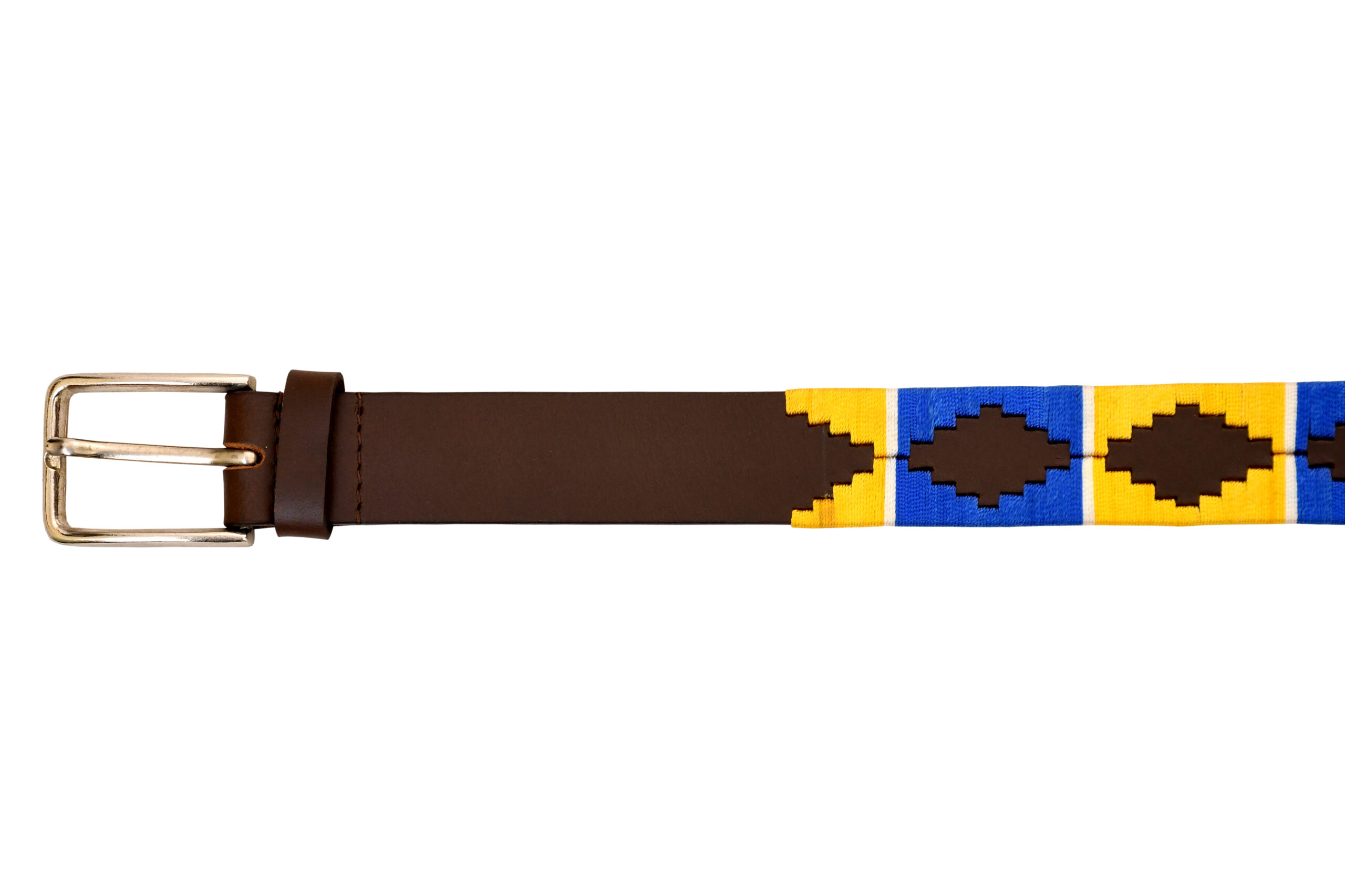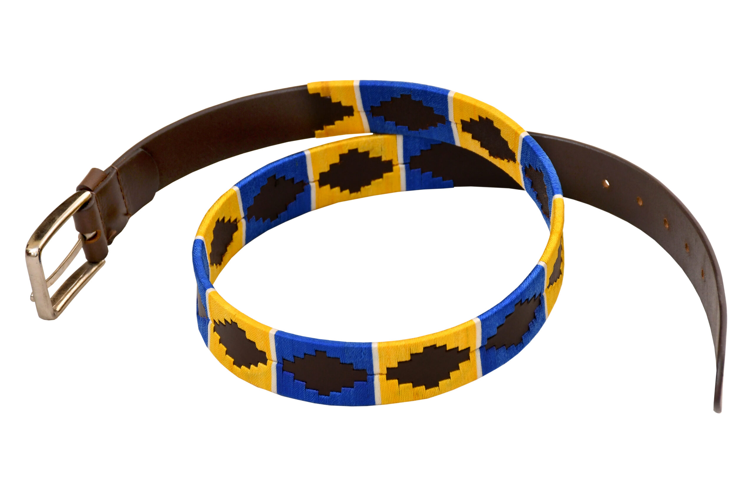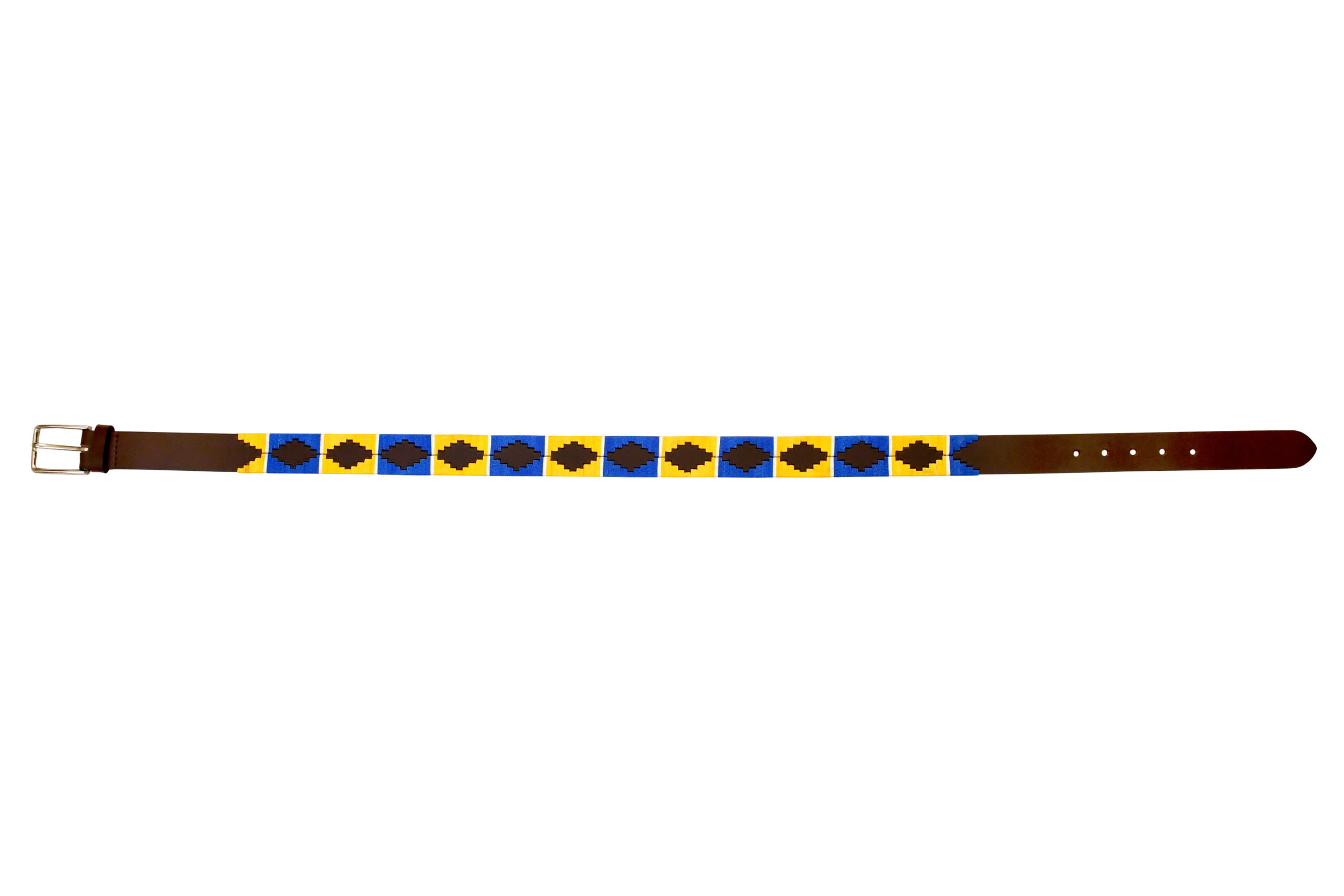 This polo belt is made from full grain leather with a bold stitched pattern in red and blue each section features a black diamond shape for contrast and symmetry the gold buckle adds a clean finish and the belt includes multiple holes for easy adjustment the stitching is tight and the leather is smooth strong and built to last .